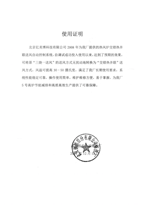• 采用了高精度的数字液压冷风调节阀、热风炉智能热工模型,结合“神经元矩阵模型推演算法”、具有专家知识库的热风炉自适应智能调节算法、模糊控制系统等,可以将热风温度波动值控制在±5℃以内。