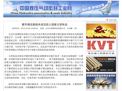 北京亿美博科技有限公司成功开发并领先世界的数字液压新技术得到水电领域的高度认可,自从第一套30万千万的水轮机筒型阀同步提升装置于2009年初在浙江摊坑电站投运以来,已经无故障运行3年半了,其后东电在锦屏和溪洛渡的15套77万千万的大型水轮机机组全部采用了亿美博科技有限公司的数字液压产品,于今年完成了...
