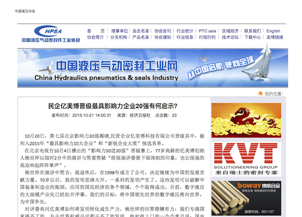 10月20日,第七届北京影响力20强揭晓,民营企业亿美博科技有限公司晋级其中,被列入2015年“最具影响力10大企业”和“新锐企业大奖”候选名单。中国液压协会网站转发《经济日报社》文《民企亿美博晋级最具影响力企业20强有何启示?》...